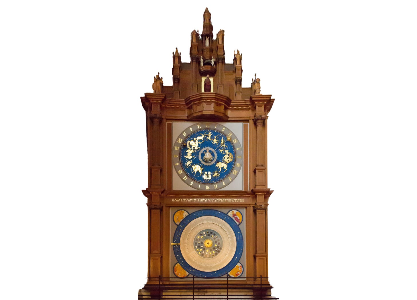 I stood at the foot of this contraption a few years ago. The original was built around 1561 and destroyed in 1942 when a British air raid on the night of Palm Sunday almost razed the nearly 700-year-old basilica. There is a set of enormous ancient bells shattered in a crater nearby. They last rang while racing toward the floor of the South Tower. The new horologium was finished in 1967 by Paul Behrens, an artisan who maintained it until the day he died. It gives you the impression that the creator wanted to capture the totality of this life and the cosmos in which it is contained, like a pilgrim who stood outside of it and brought back a glimpse to show us other ways of seeing.